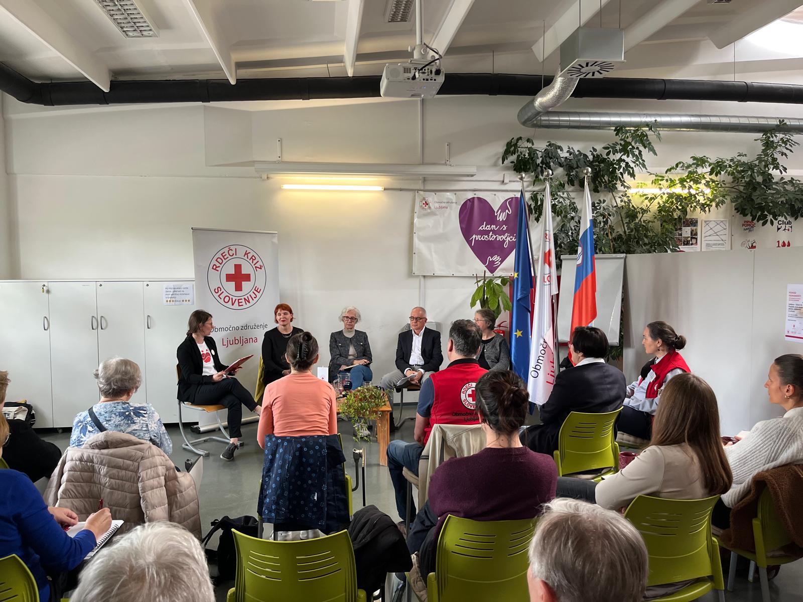 Na okrogli mizi z naslovom "Starost med dostojanstvom in revščino: Ali kot družba izgubljamo empatijo?", ki smo jo organizirali v torek, 21. 4. 2026 so sodelovali mag. Barbara Purkart, direktorica Doma starejših občanov Fužine, Amalija Šiftar, prostovoljka in koordinatorka programa Starejši za starejše pri ZDUS, Aleš Kenda, sekretar na Ministrstvo za solidarno prihodnost, ter dr. Vesna Leskošek, profesorica na Fakulteta za socialno delo, raziskovalka socialne države, revščine in neenakosti v Sloveniji. Okroglo mizo je moderirala strokovna sodelavka RKS-OZ Ljubljana, Klara Golob.