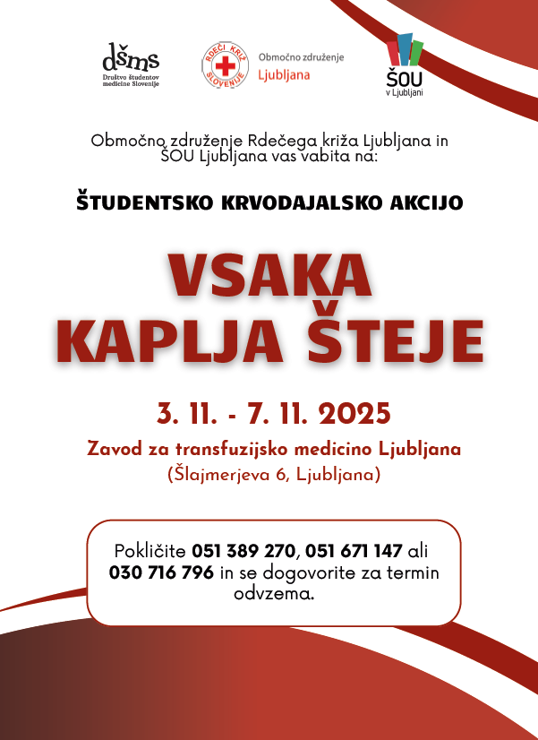 Rdeči križ Slovenije – Območno združenje Ljubljana in ŠOU Ljubljana vabita na študentke in študente k sodelovanju v študentski krvodajalski akciji, ki bo potekala od 3. do 7. novembra na Zavodu za transfuzijsko medicino, Šlajmerjeva 6 v Ljubljani.