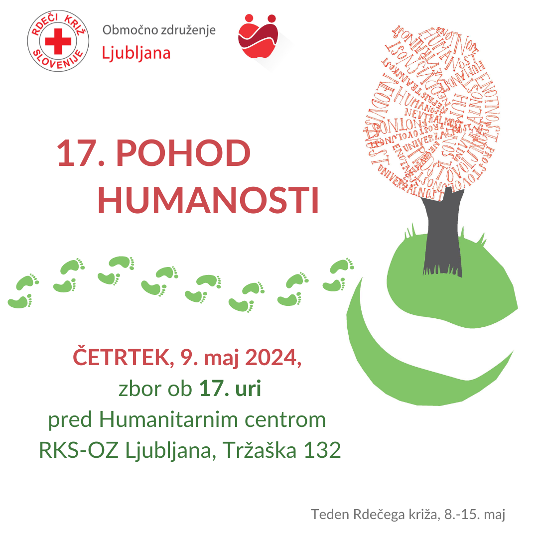 V četrtek, 9. maja 2024, vas vabimo na tradicionalni, že 17. Pohod humanosti! Zbor je ob 17. uri pred Humanitarnim centrom RKS-OZ Ljubljana, na Tržaški cesti 132 v Ljubljani.