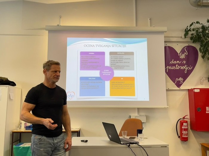 Predavatelj Tadej Cunder nam je predstavil, kako prepoznati in oceniti tveganja v nevarnih situacijah, katera komunikacija je ključna za uspešno de-eskalacijo ter kako ustrezno ravnati, kadar komunikacija ne zadošča.