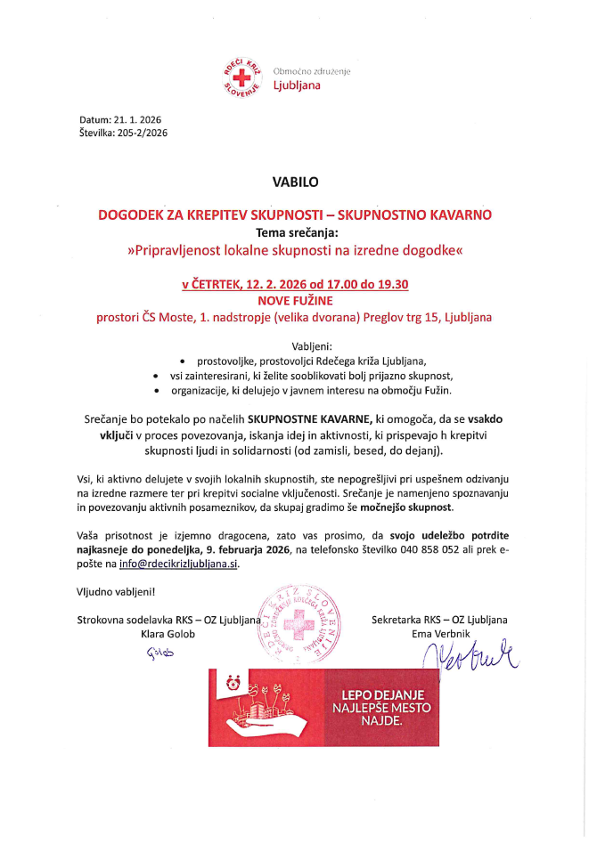 Vaša prisotnost je izjemno dragocena, zato vas prosimo, da svojo udeležbo potrdite najkasneje do ponedeljka, 9. februarja 2026, na telefonsko številko 040 858 052 ali prek e-pošte na info@rdecikrizljubljana.si.